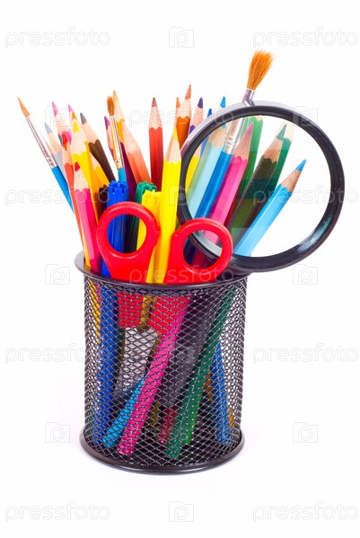 Набор канцелярских предметов в металлическом стакане на белом фоне