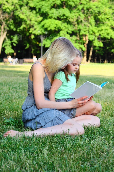 Мама с дочкой читают книгу, сидя на зеленой лужайке