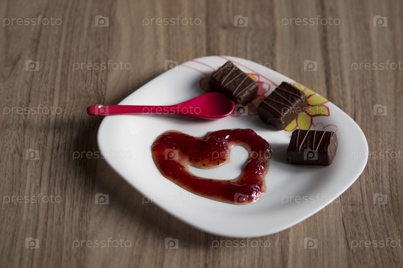 Малиновое варенье, сладкие конфеты и красный чайная ложка для любимой