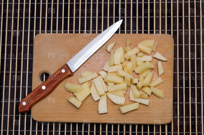 Группа нарезанный картофель на деревянные разделочную доску с острым ножом