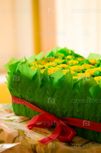 Одуванчики в подарочной упаковке с красной лентой