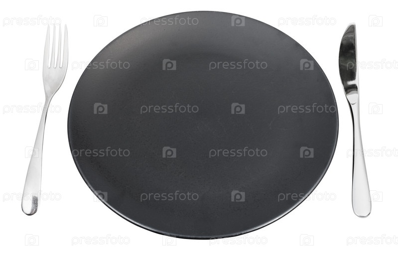 Черная тарелка с вилкой и ножом