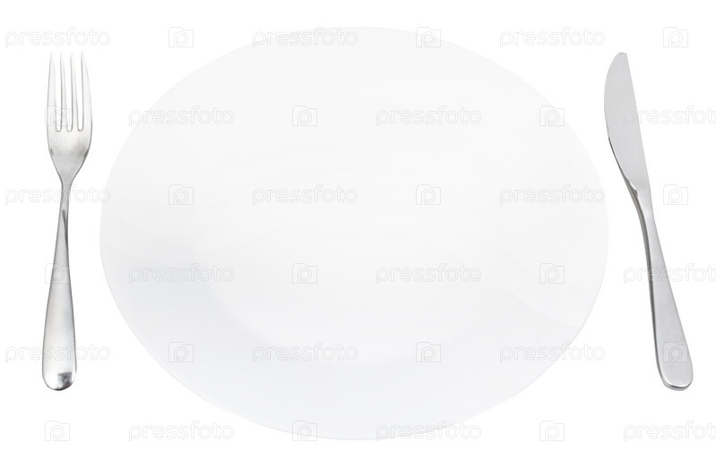 Белая тарелка с вилкой и ножом
