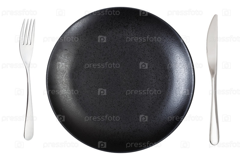 Черная тарелка с вилкой и ножом
