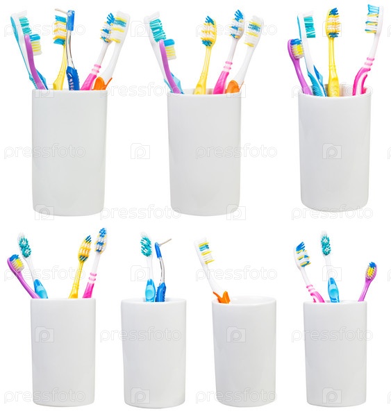 Коллекция зубных щеток в стаканах