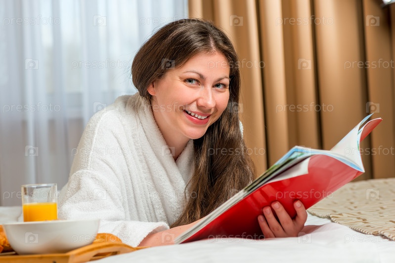 Брюнетка с журналом в постели