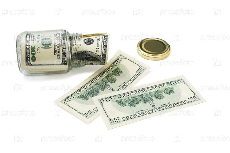 Доллары, сложенные в стеклянную банку, на белом фоне