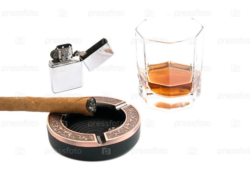 Сигара в пепельнице и стакан виски