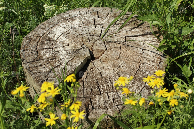Пень и желтые цветы