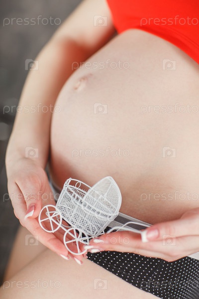 Беременная девушка держит игрушечную коляску