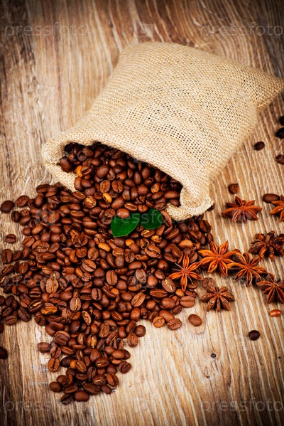 Мешок с кофейными зернами на деревянном фоне