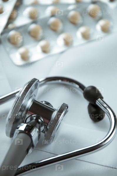Стетоскоп и блистеры с таблетками