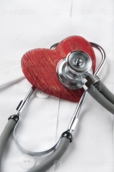 Фонендоскоп и красное деревянное сердце на медицинском халате