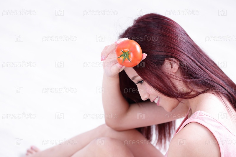 Девушка показывает помидор