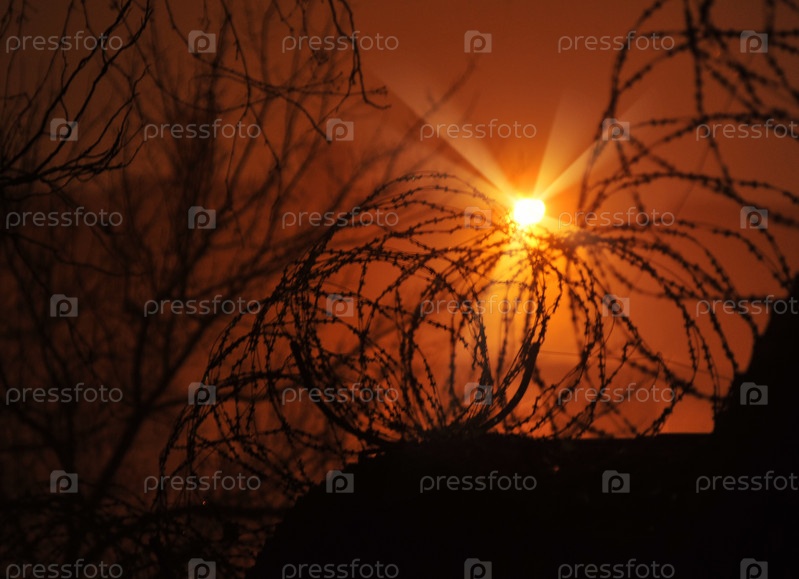 Закат за забором из колючей проволоки