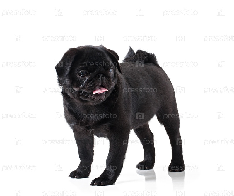 Черный щенок мопса на белом фоне