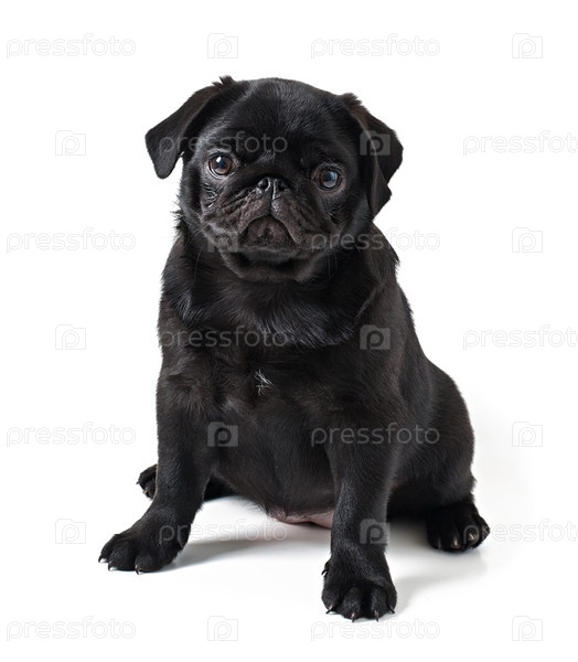 Черный щенок мопса на белом фоне