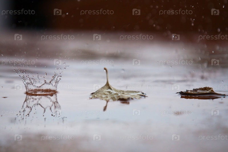 Сухие листья и капли дождя на поверхности воды