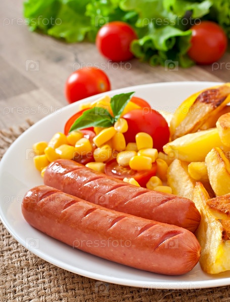 Колбаса с жареным картофелем и овощами на тарелке