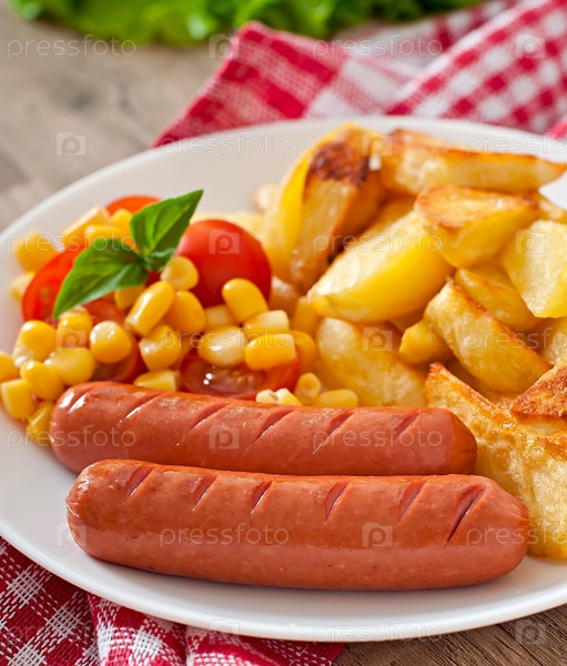 Колбаса с жареным картофелем и овощами на тарелке