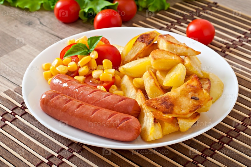 Колбаса с жареным картофелем и овощами на тарелке