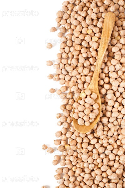 Сырой нут в ложке на белом фоне