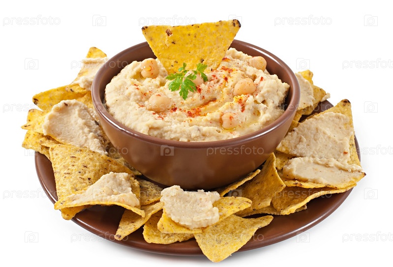 Здоровые домашние хумус с оливковым маслом и лаваш фишек, изолированные на белом фоне