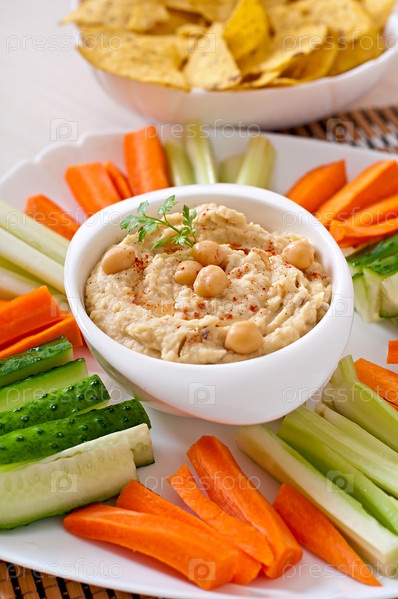 Здоровые домашние хумус с овощами, оливковое масло и лаваш фишек