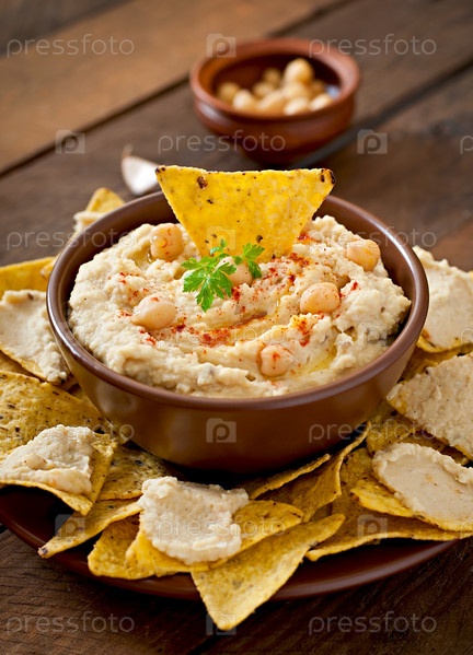 Здоровые домашние хумус с овощами, оливковое масло и лаваш фишек