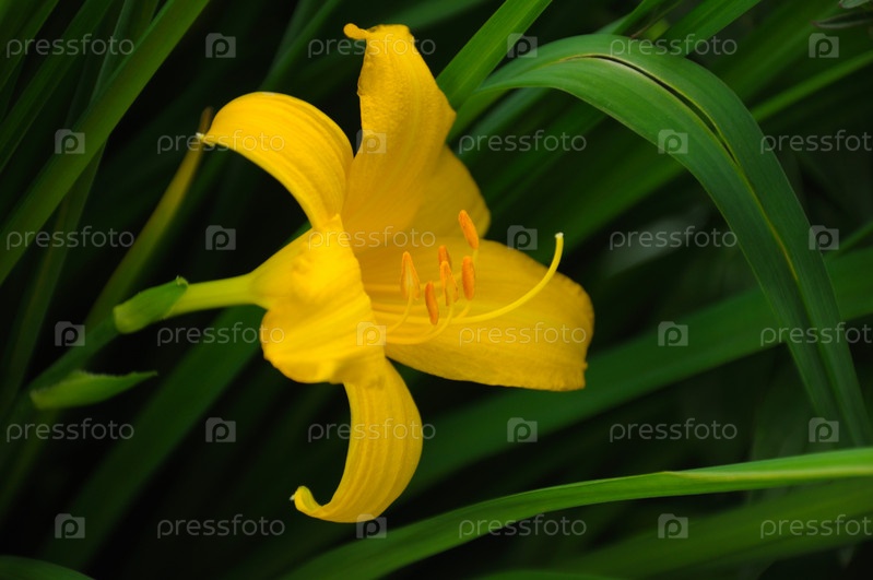 Цветок желтого лилейника среди листвы