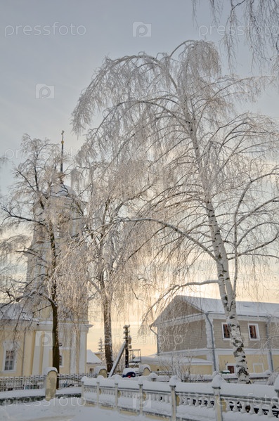 Православная церковь в окружении заснеженных деревьев