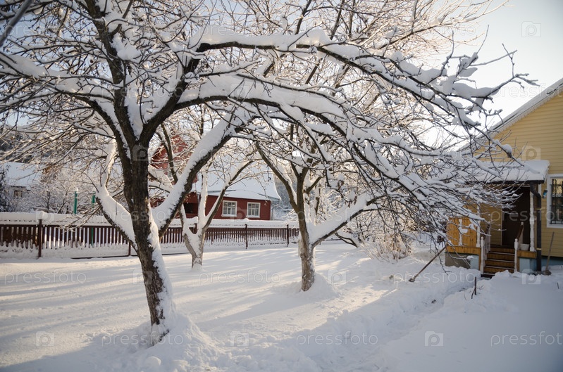 Коттеджи в окружении замороженных деревьев