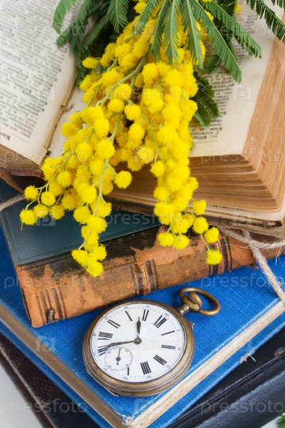 Куча старых книг с карманные часы
