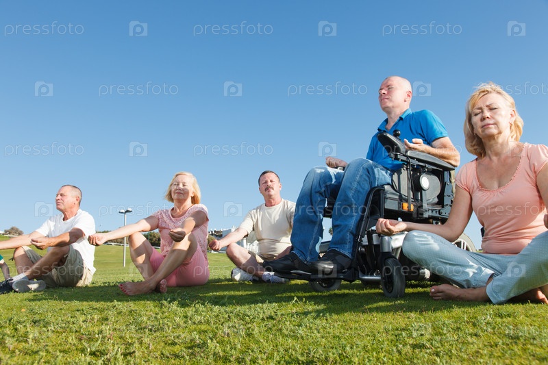 Инвалидов с семьей занимается йогой на природе