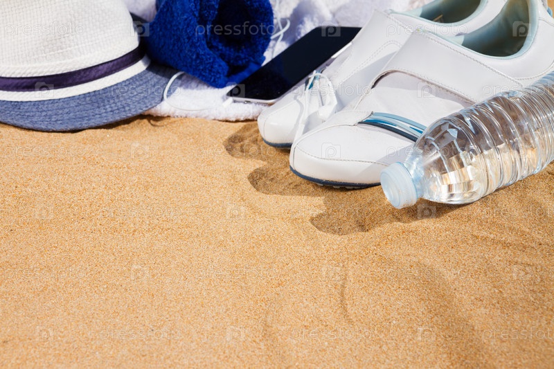 Белые кроссовки и шляпа на песке