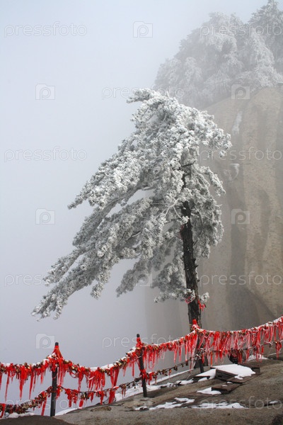 Замерзшее дерево и красные ленточки на заборе на горе Хуашань, провинция Шэньси, Китай