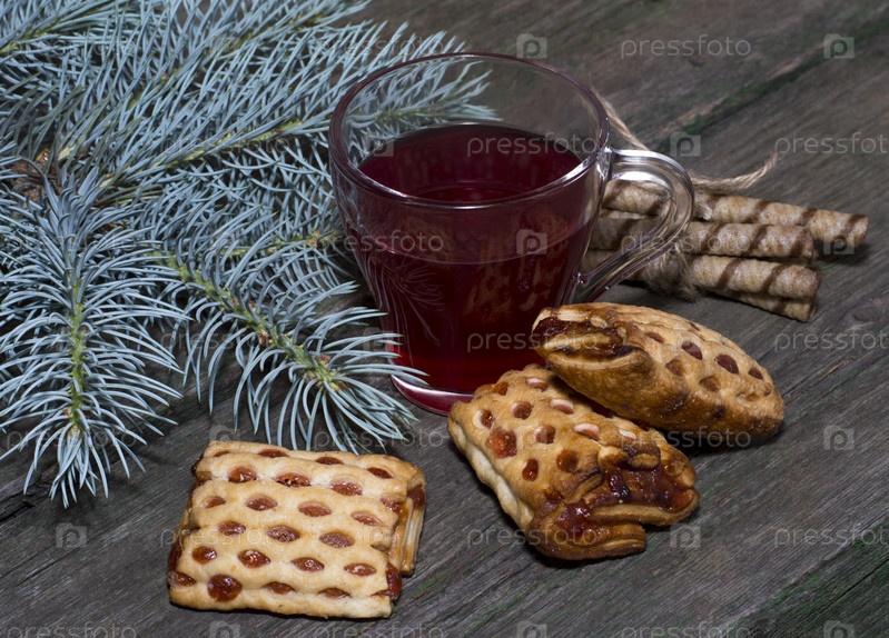 Стакан чая, с печеньем и елью