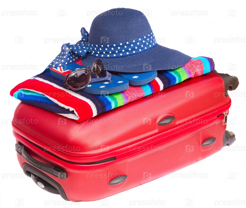 Красный чемодан с голубой шляпой