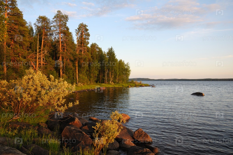 Берег озера на заката солнца. Карелия