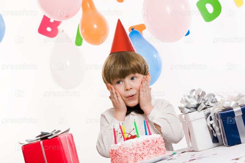 Портрет удивленного парня, прикасающегося к его щекам и оглядывающегося в сторону на замечательный подарок