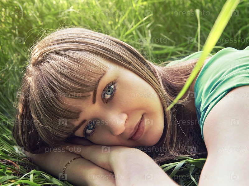 Молодая красивая девушка лежит на траве
