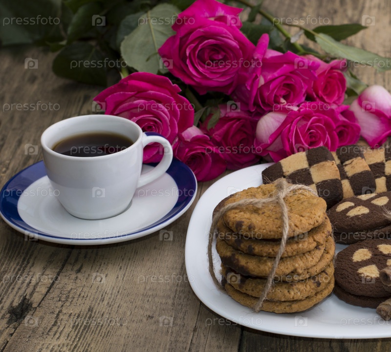 Чашка кофе и печенье на тарелку с букетом роз