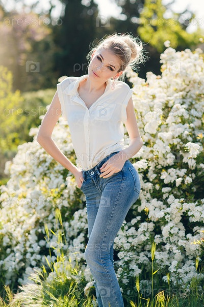 Красивая женщина в цветущем саду