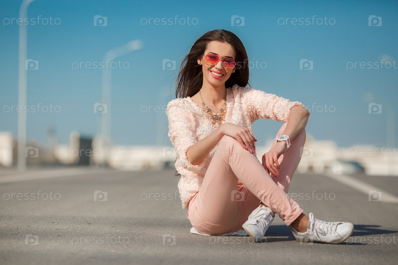 Красивая женщина сидит на дороге