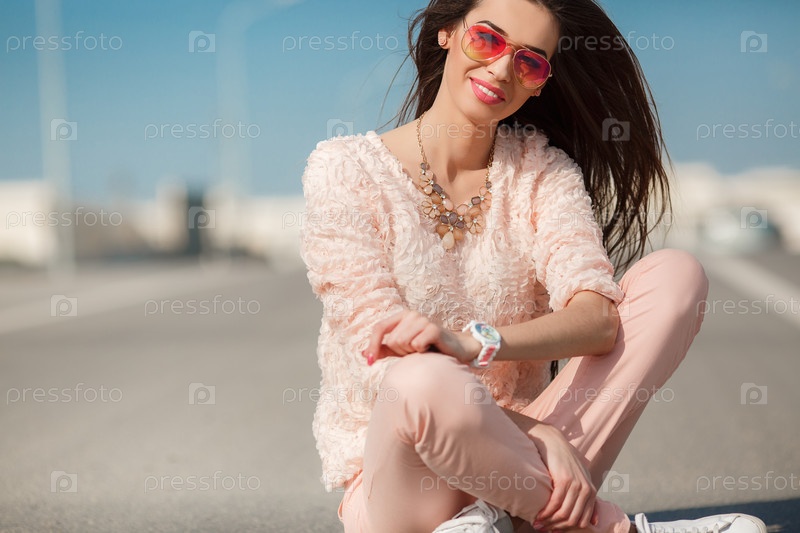 Красивая женщина сидит на дороге