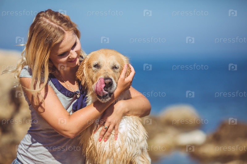 Девушка у моря гуляет с лабрадором