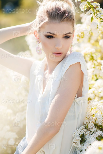 Красивая женщина в цветущем саду