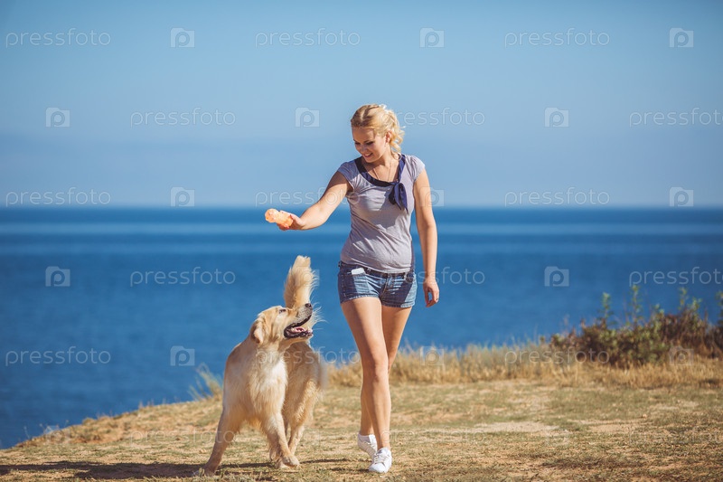 Девушка у моря гуляет с лабрадором