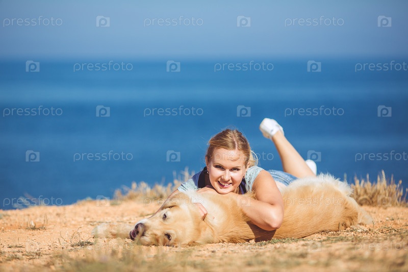 Девушка у моря гуляет с лабрадором