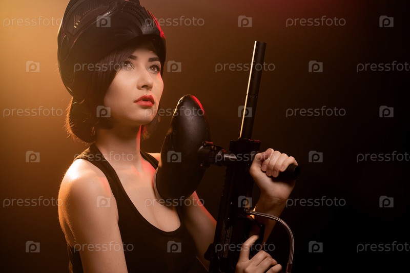 Девушка позирует с ружьем для пейнтбола